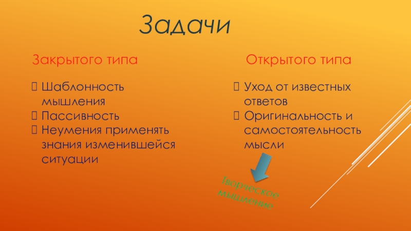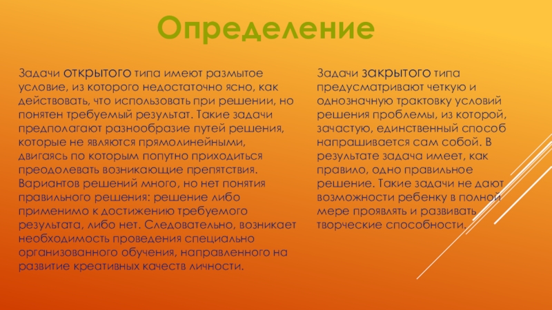 Задачи закрытого типа предусматривают четкую и однозначную трактовку условий решения проблемы, из которой, зачастую, единственный способ напрашивается сам собой. В результате задача имеет, как правило, одно правильное решение. Такие задачи не дают возможности ребенку в полной мере проявлять и развивать творческие способности.