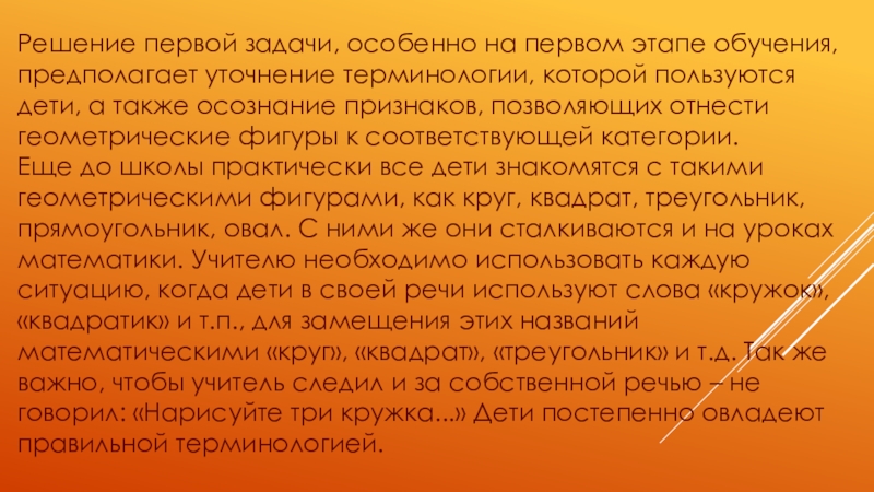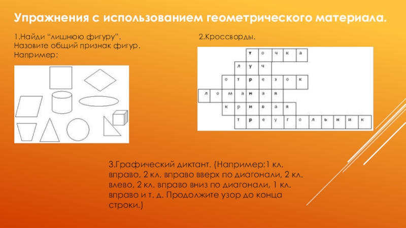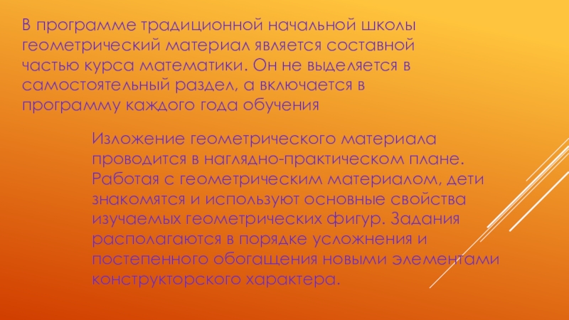 Изложение геометрического материала проводится в наглядно-практическом плане. Работая с геометрическим материалом, дети знакомятся и используют основные свойства изучаемых геометрических фигур. Задания располагаются в порядке усложнения и постепенного обогащения новыми элементами конструкторского характера.