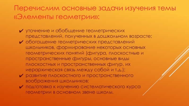 обогащение геометрических представлений школьников, формирование некоторых основных геометрических понятий (фигура, плоскостные и пространственные фигуры, основные виды плоскостных и пространственных фигур, их иерархическая связь между собой и т.д.);