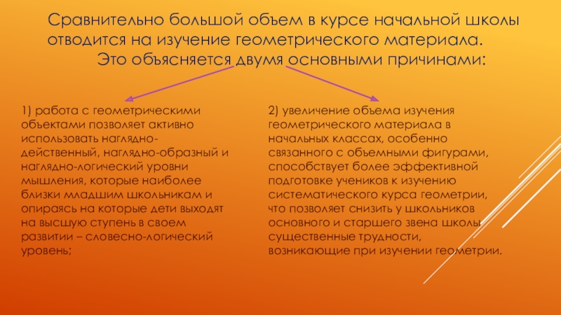 1) работа с геометрическими объектами позволяет активно использовать наглядно-действенный, наглядно-образный и наглядно-логический уровни мышления, которые наиболее близки младшим школьникам и опираясь на которые дети выходят на высшую ступень в своем развитии – словесно-логический уровень;