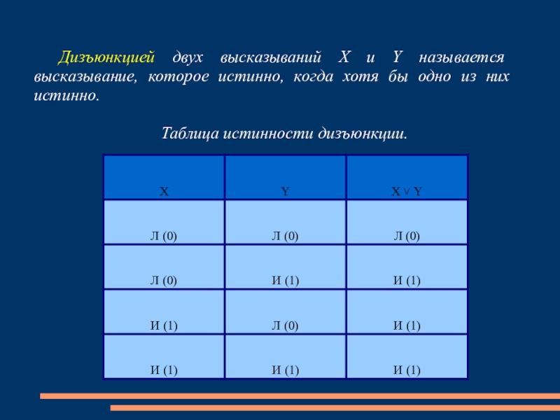 Слайд 10 Дизъюнкцией двух высказываний Х и Y называется высказывание, которое истинно, когда