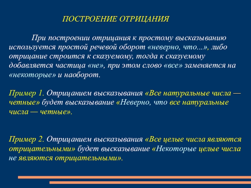 Пример 1. Отрицанием высказывания «Все натуральные числа — четные» будет высказывание «Неверно, что все натуральные числа — четные».