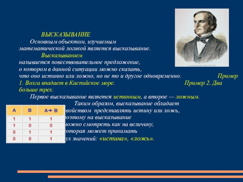 что оно истинно или ложно, но не то и другое одновременно. Пример 1. Волга впадает в Каспийское море. Пример 2. Два больше трех.