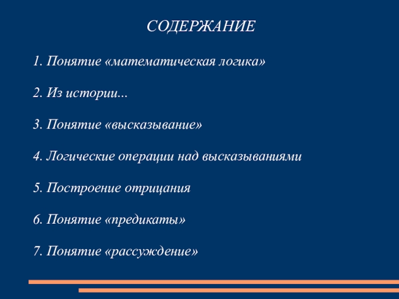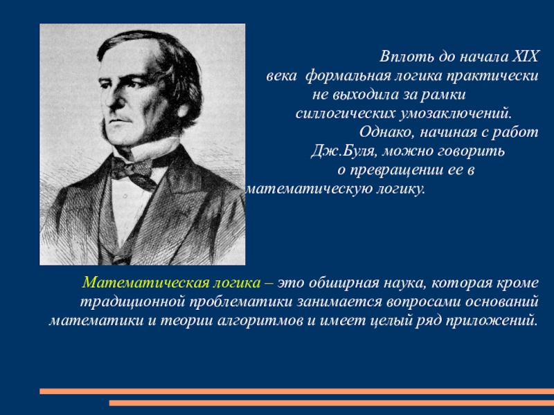 Математическая логика – это обширная наука, которая кроме традиционной проблематики занимается вопросами оснований математики и теории алгоритмов и имеет целый ряд приложений.