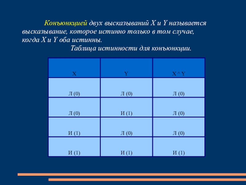 Слайд 9 Конъюнкцией двух высказываний Х и Y называется высказывание, которое истинно только