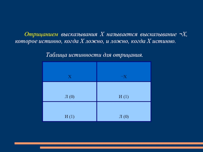 Слайд 8 Отрицанием высказывания Х называется высказывание ¬Х, которое истинно, когда Х ложно,