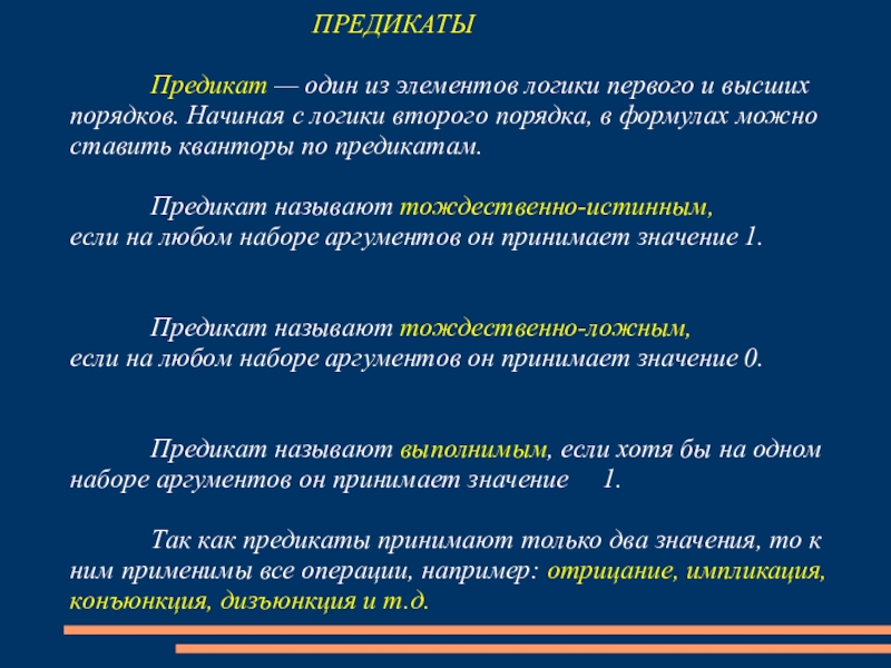 Так как предикаты принимают только два значения, то к ним применимы все операции, например: отрицание, импликация, конъюнкция, дизъюнкция и т.д.