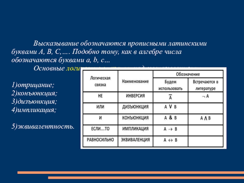 Слайд 7 Высказывание обозначаются прописными латинскими буквами A, B, C,…. Подобно тому, как