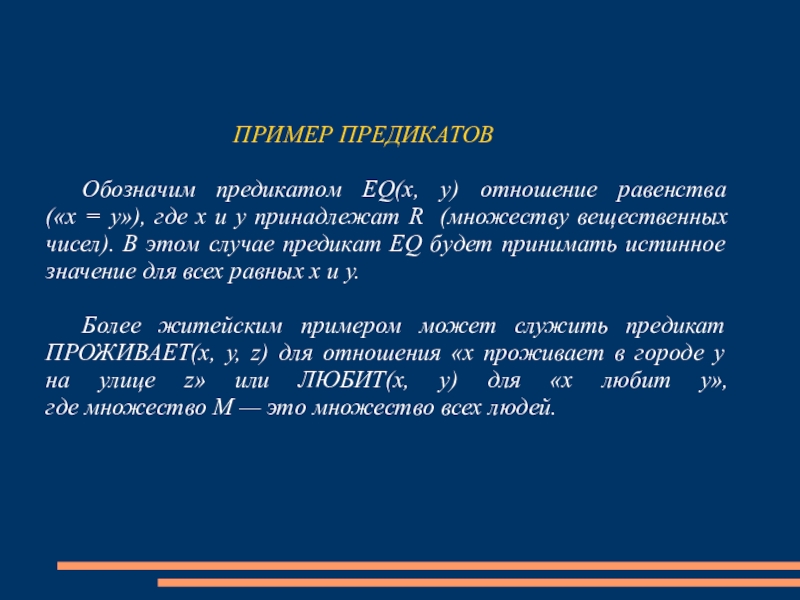 («x = y»), где x и y принадлежат R (множеству вещественных чисел). В этом случае предикат EQ будет принимать истинное значение для всех равных x и y.