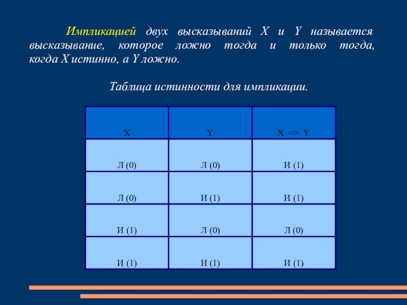 Слайд 11 Импликацией двух высказываний Х и Y называется высказывание, которое ложно тогда