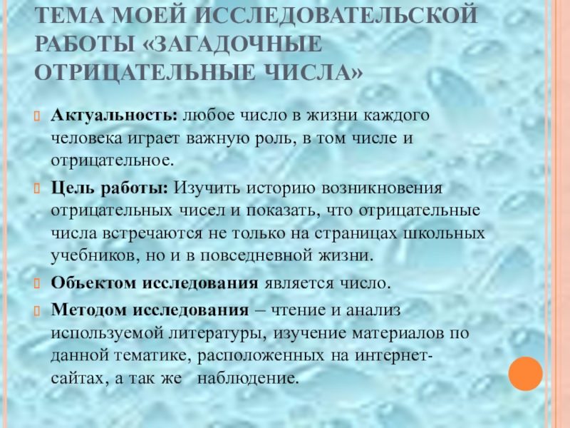 Слайд 3ТЕМА МОЕЙ ИССЛЕДОВАТЕЛЬСКОЙ РАБОТЫ «ЗАГАДОЧНЫЕ ОТРИЦАТЕЛЬНЫЕ ЧИСЛА»