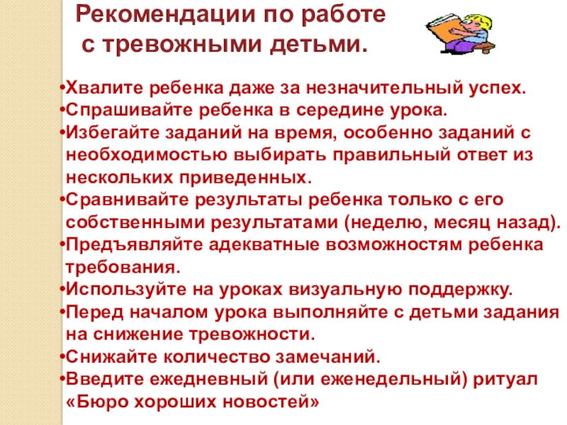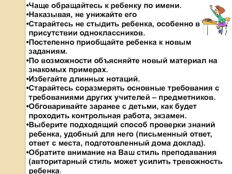 Обратите внимание на Ваш стиль преподавания (авторитарный стиль может усилить тревожность ребенка).