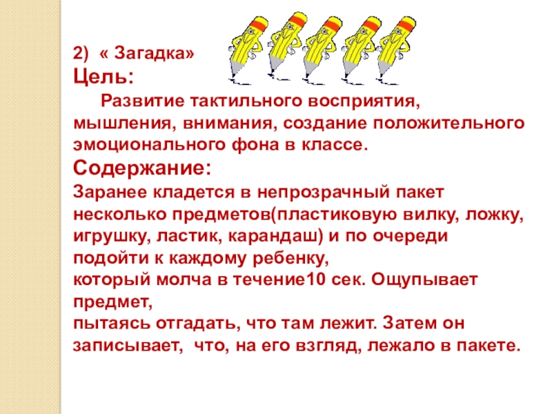 Заранее кладется в непрозрачный пакет несколько предметов(пластиковую вилку, ложку, игрушку, ластик, карандаш) и по очереди подойти к каждому ребенку,