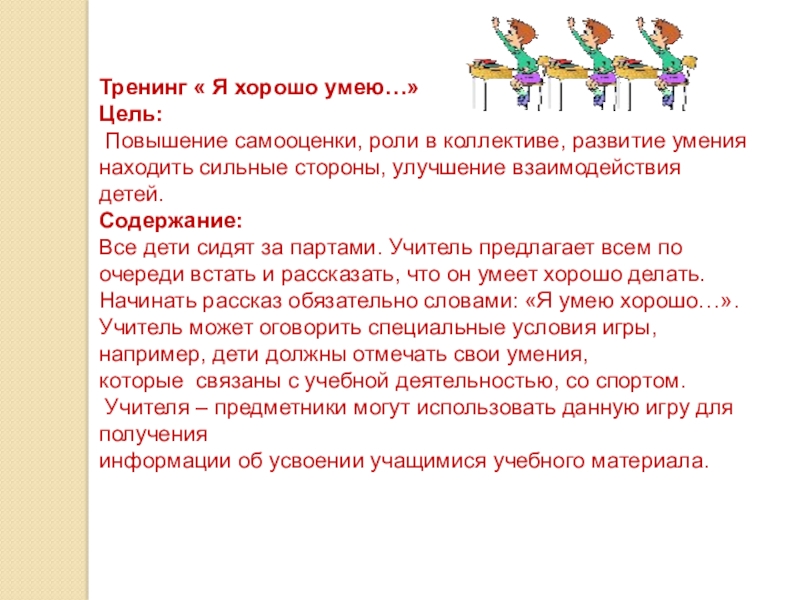 Все дети сидят за партами. Учитель предлагает всем по очереди встать и рассказать, что он умеет хорошо делать. Начинать рассказ обязательно словами: «Я умею хорошо…». Учитель может оговорить специальные условия игры, например, дети должны отмечать свои умения,