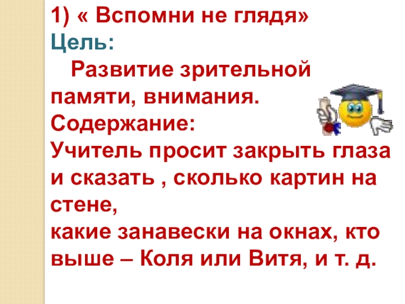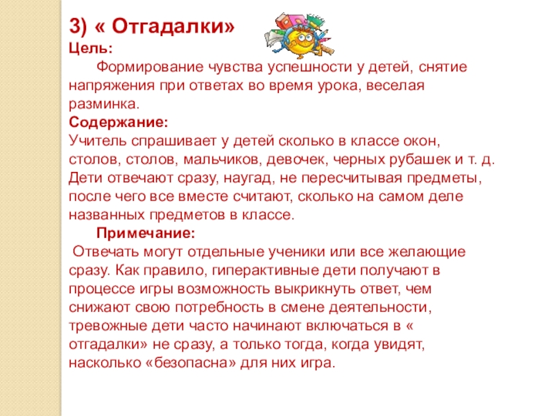 Отвечать могут отдельные ученики или все желающие сразу. Как правило, гиперактивные дети получают в процессе игры возможность выкрикнуть ответ, чем снижают свою потребность в смене деятельности, тревожные дети часто начинают включаться в « отгадалки» не сразу, а только тогда, когда увидят, насколько «безопасна» для них игра.