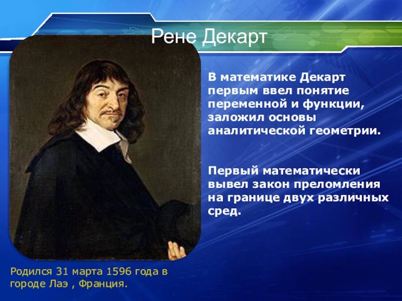 В математике Декарт первым ввел понятие переменной и функции, заложил основы аналитической геометрии.