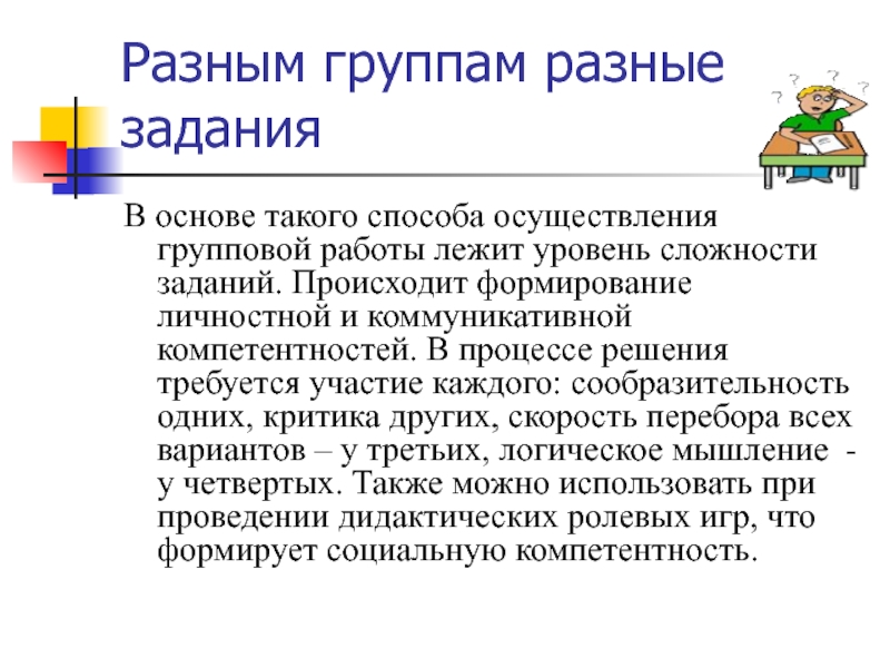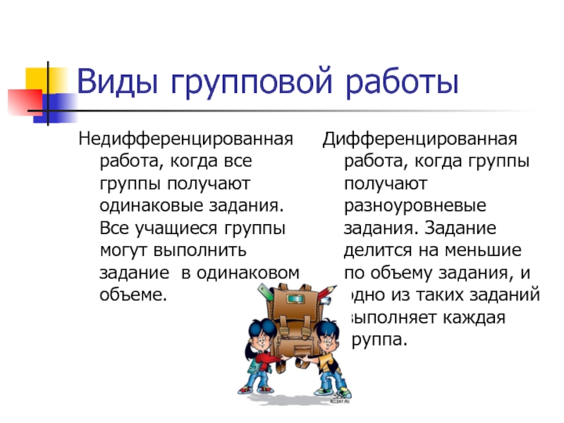 Дифференцированная работа, когда группы получают разноуровневые задания. Задание делится на меньшие по объему задания, и одно из таких заданий выполняет каждая группа.