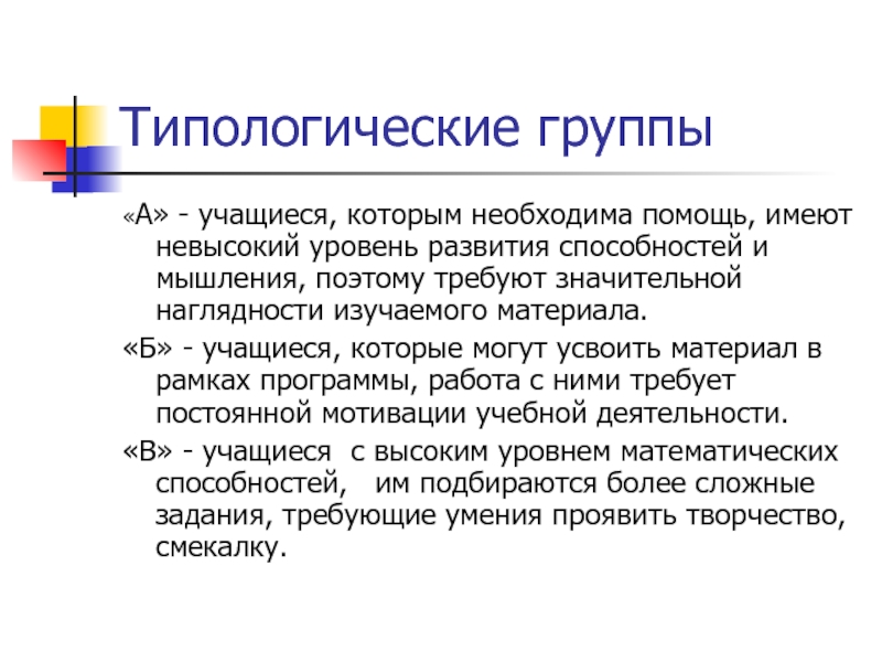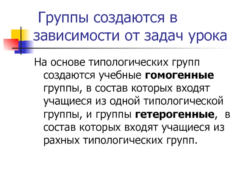 создаются учебные гомогенные группы, в состав которых входят учащиеся из одной типологической группы, и группы гетерогенные, в состав которых входят учащиеся из рахных типологических групп.