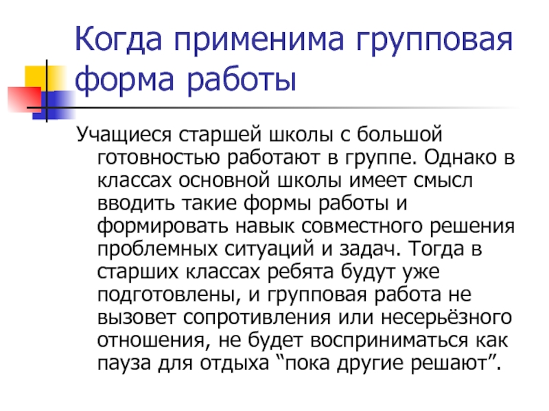 в группе. Однако в классах основной школы имеет смысл вводить такие формы работы и формировать навык совместного решения проблемных ситуаций и задач. Тогда в старших классах ребята будут уже подготовлены, и групповая работа не вызовет сопротивления или несерьёзного отношения, не будет восприниматься как пауза для отдыха “пока другие решают”.