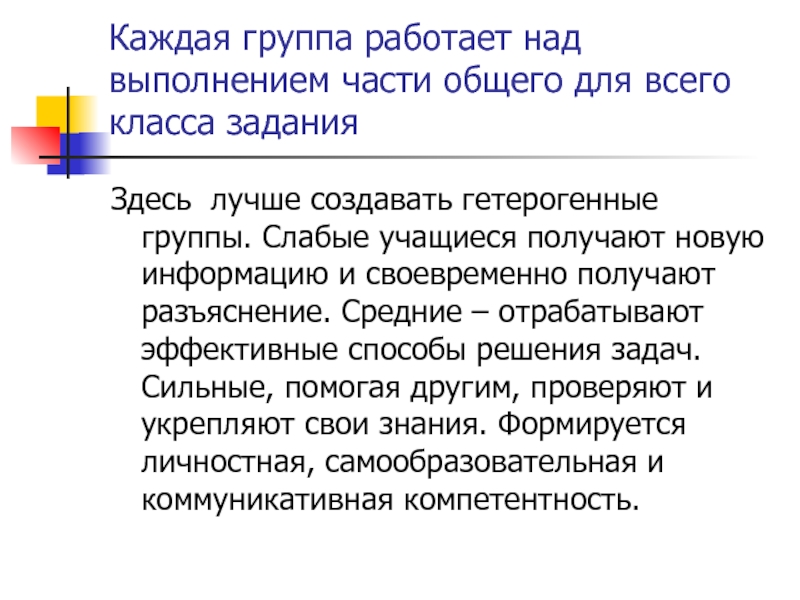 лучше создавать гетерогенные группы. Слабые учащиеся получают новую информацию и своевременно получают разъяснение. Средние – отрабатывают эффективные способы решения задач. Сильные, помогая другим, проверяют и укрепляют свои знания. Формируется личностная, самообразовательная и коммуникативная компетентность.