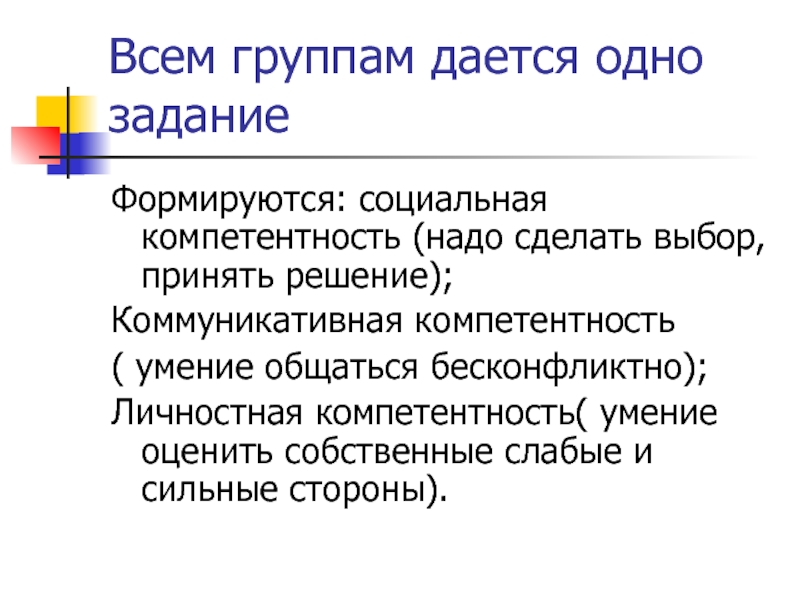 уровень сложности заданий. Происходит формирование личностной и коммуникативной компетентностей. В процессе решения требуется участие каждого: сообразительность одних, критика других, скорость перебора всех вариантов – у третьих, логическое мышление - у четвертых. Также можно использовать при проведении дидактических ролевых игр, что формирует социальную компетентность.