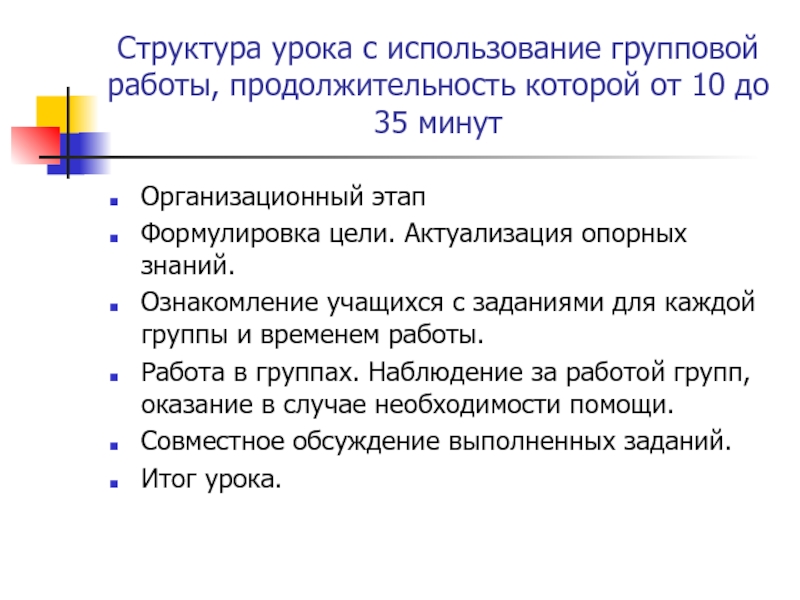 Слайд 7Структура урока с использование групповой работы, продолжительность которой от 10 до