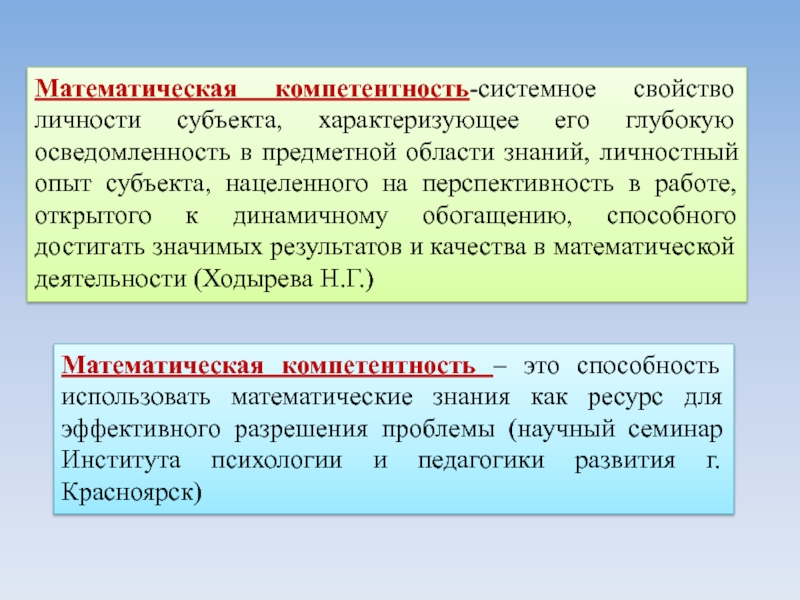 Математическая компетентность – это способность использовать математические знания как ресурс для эффективного разрешения проблемы (научный семинар Института психологии и педагогики развития г. Красноярск)