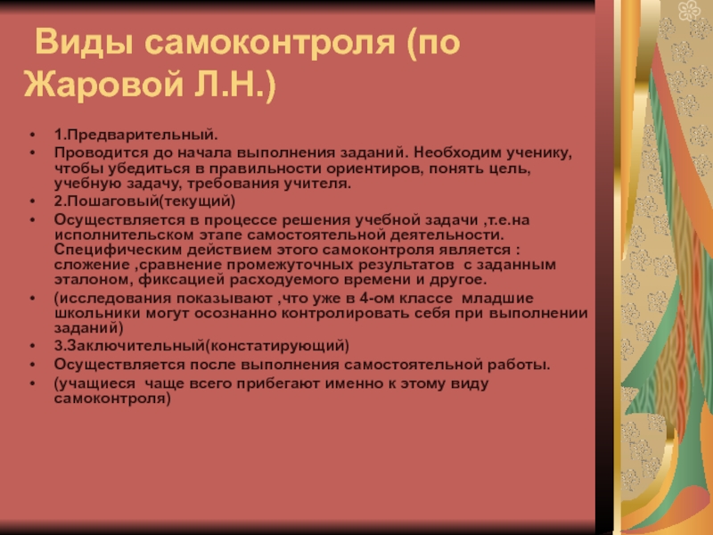 Слайд 3 Виды самоконтроля (по Жаровой Л.Н.)