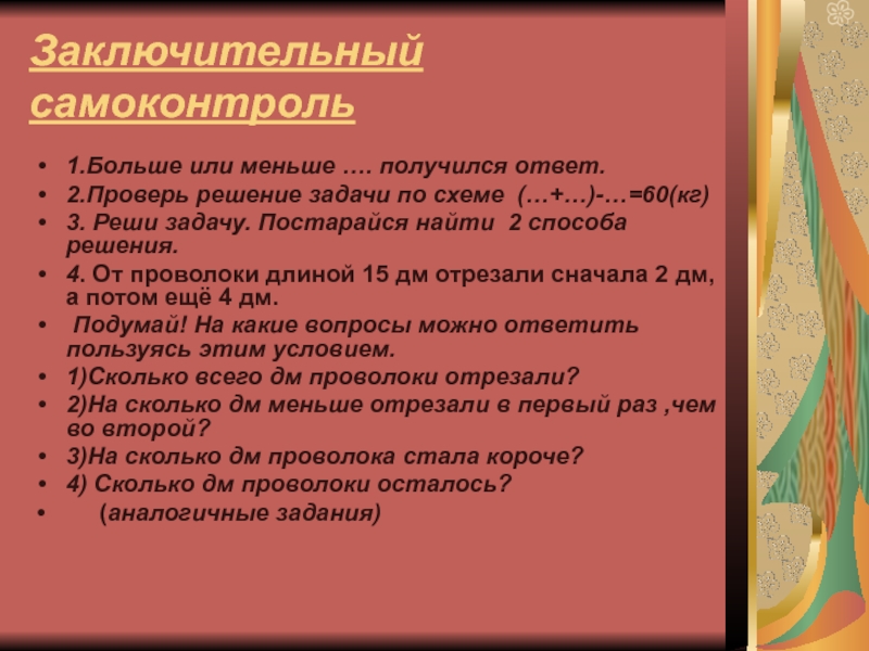 4. От проволоки длиной 15 дм отрезали сначала 2 дм, а потом ещё 4 дм.