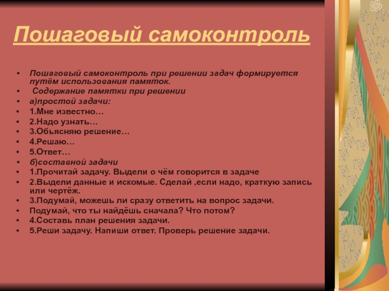 Пошаговый самоконтроль при решении задач формируется путём использования памяток.