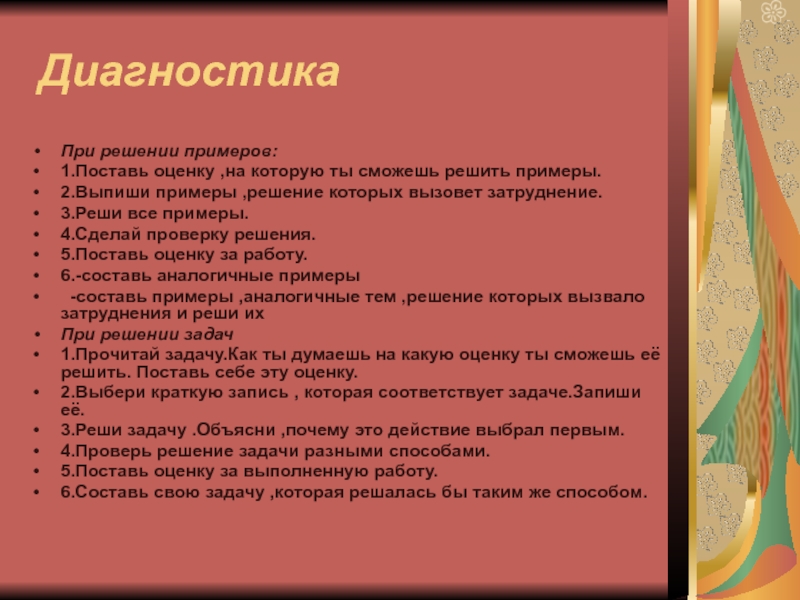 Реши только те примеры в которых не ошибаешься .Те примеры в которых сомневаешься тоже решай, но запиши ответ карандашом , а примеры ,которые не умеешь решать –не решай.