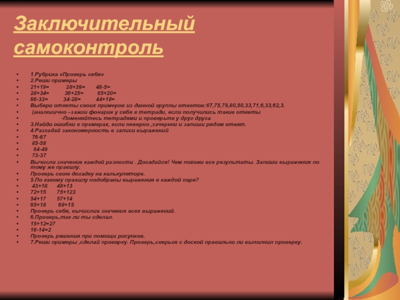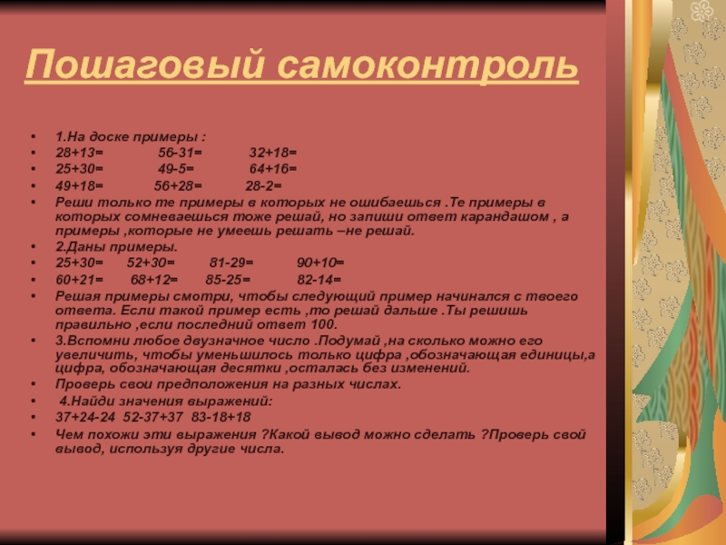 Решая примеры смотри, чтобы следующий пример начинался с твоего ответа. Если такой пример есть ,то решай дальше .Ты решишь правильно ,если последний ответ 100.