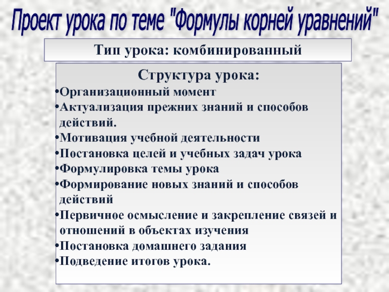 Типы уроков при изучении темы разнообразны. Это урок информирующего типа (урок изучения нового материала, закрепления знаний, умений, навыков, урок повторения), проблемный урок, урок-исследование и др.
