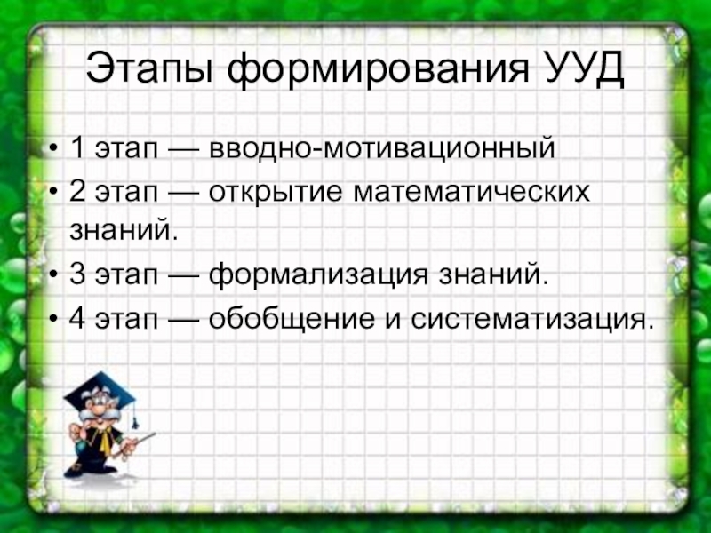Этапы формирования УУД1 этап — вводно-мотивационный 2 этап — открытие математических знаний. 3 этап — формализация знаний.