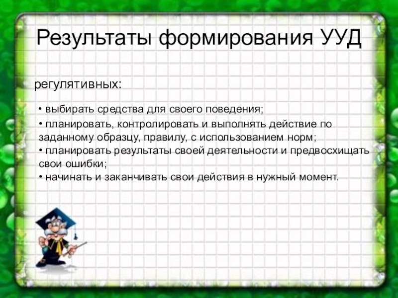 Результаты формирования УУД регулятивных:  • выбирать средства для своего поведения; • планировать, контролировать и выполнять действие