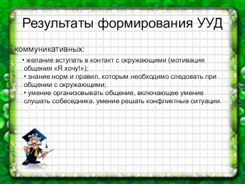 Результаты формирования УУДкоммуникативных:   • желание вступать в контакт с окружающими (мотивация общения «Я хочу!»); •