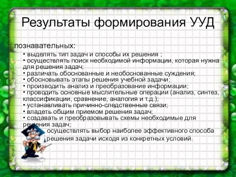 Результаты формирования УУД  познавательных:   • выделять тип задач и способы их решения ; • осуществлять