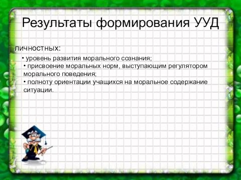 Результаты формирования УУДличностных:   • уровень развития морального сознания; • присвоение моральных норм, выступающим регулятором морального