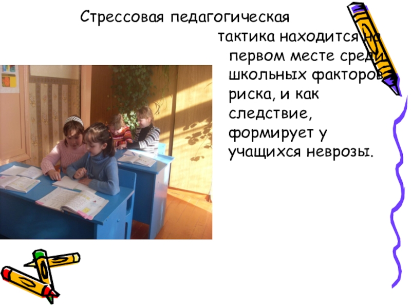 Стрессовая педагогическая тактика находится на первом месте среди школьных факторов риска, и как следствие, формирует у учащихся