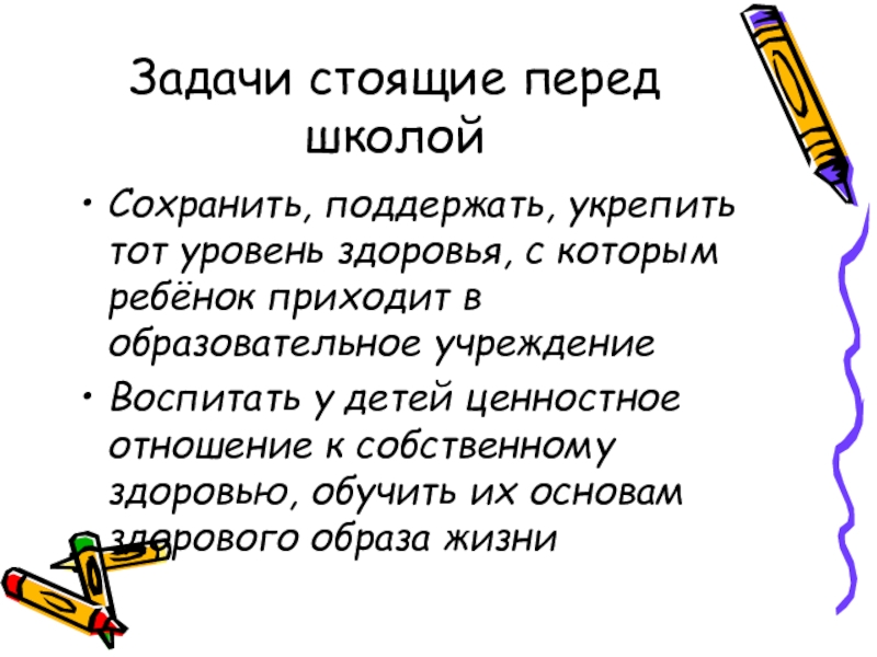 Задачи стоящие перед школойСохранить, поддержать, укрепить тот уровень здоровья, с которым ребёнок приходит в образовательное учреждениеВоспитать у
