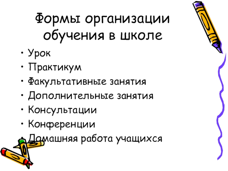 Формы организации обучения в школеУрокПрактикумФакультативные занятияДополнительные занятияКонсультацииКонференцииДомашняя работа учащихся