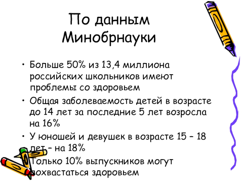 По данным МинобрнаукиБольше 50% из 13,4 миллиона российских школьников имеют проблемы со здоровьемОбщая заболеваемость детей в возрасте