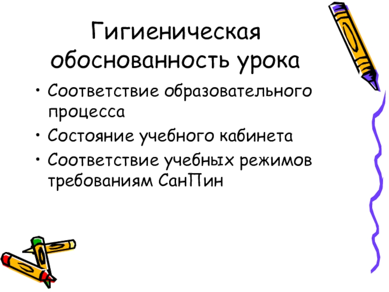 Гигиеническая обоснованность урокаСоответствие образовательного процессаСостояние учебного кабинетаСоответствие учебных режимов требованиям СанПин