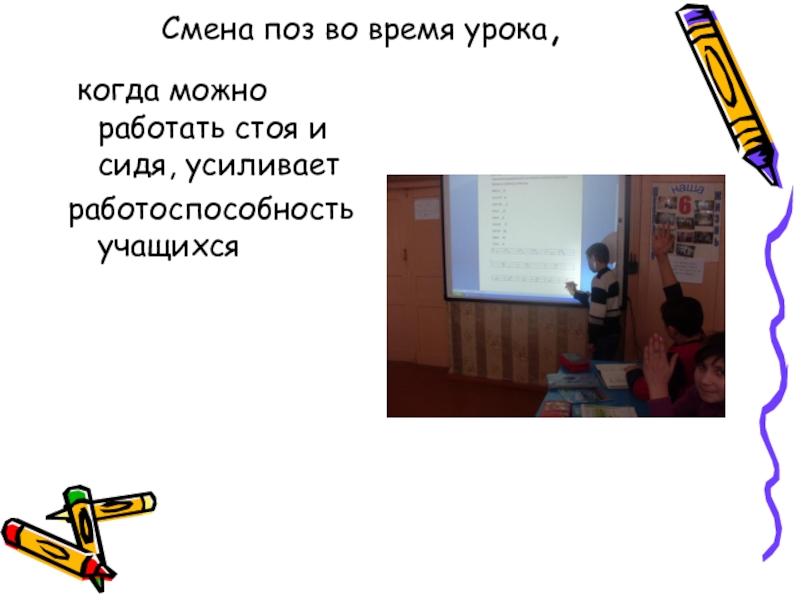 Смена поз во время урока, когда можно работать стоя и сидя, усиливаетработоспособность учащихся