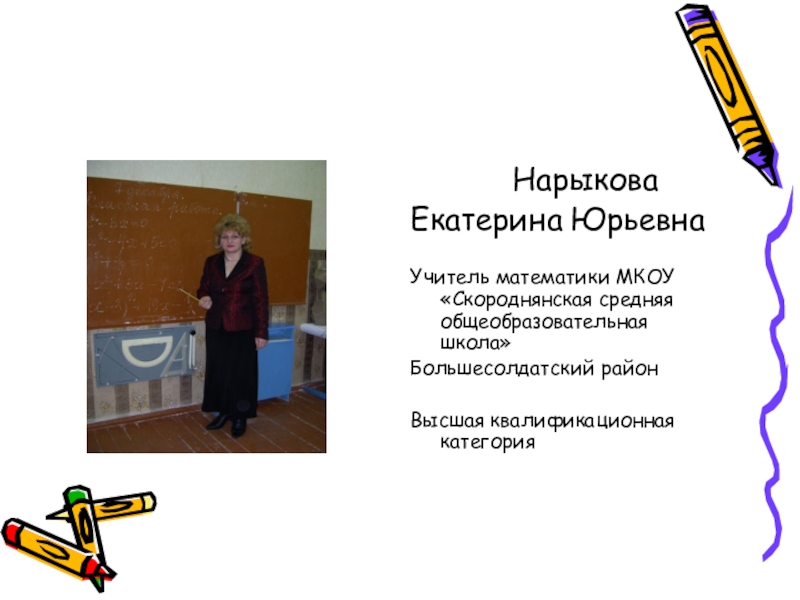 Нарыкова Екатерина ЮрьевнаУчитель математики МКОУ «Скороднянская средняя общеобразовательная школа»Большесолдатский районВысшая квалификационная категория