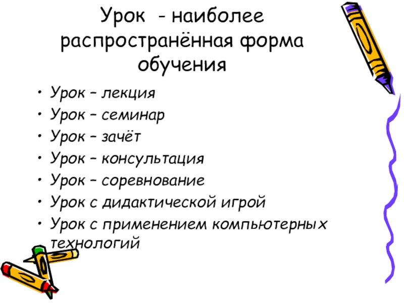 Урок - наиболее распространённая форма обученияУрок – лекцияУрок – семинарУрок – зачётУрок – консультацияУрок – соревнованиеУрок с