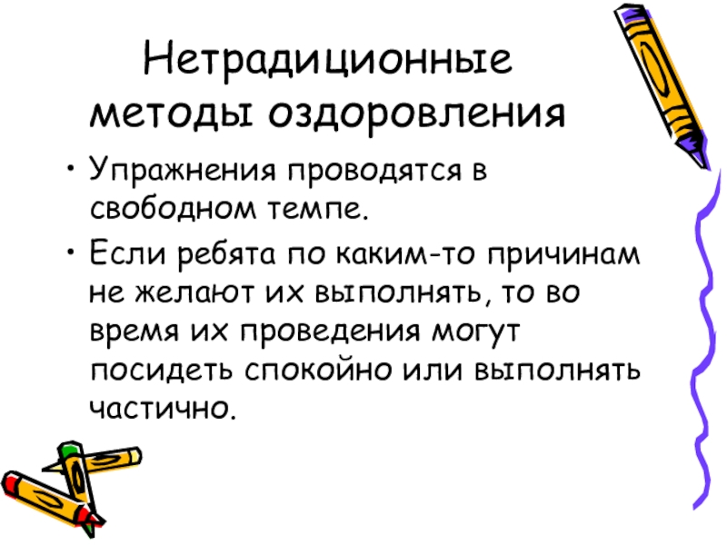 Нетрадиционные методы оздоровленияУпражнения проводятся в свободном темпе.Если ребята по каким-то причинам не желают их выполнять, то во