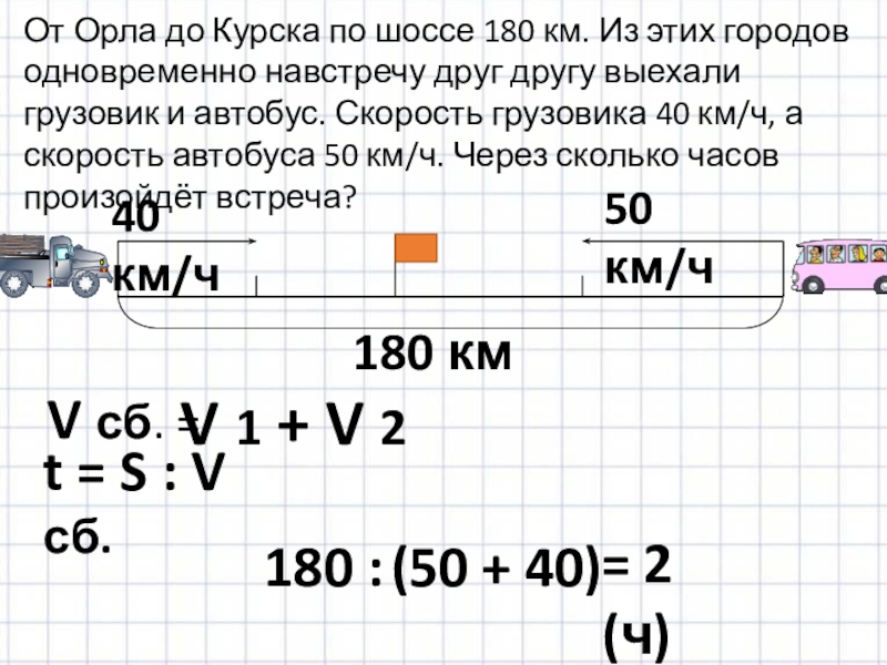 От Орла до Курска по шоссе 180 км. Из этих городов одновременно навстречу друг другу выехали грузовик и автобус. Скорость грузовика 40 км/ч, а скорость автобуса 50 км/ч. Через сколько часов произойдёт встреча?
