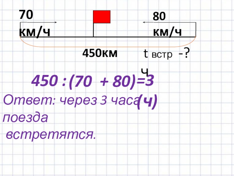 Два поезда едут навстречу друг другу. Скорость первого поезда 70 км/ч, а второго - 80 км/ч. Сейчас между ними 450 км. Через сколько времени поезда встретятся?