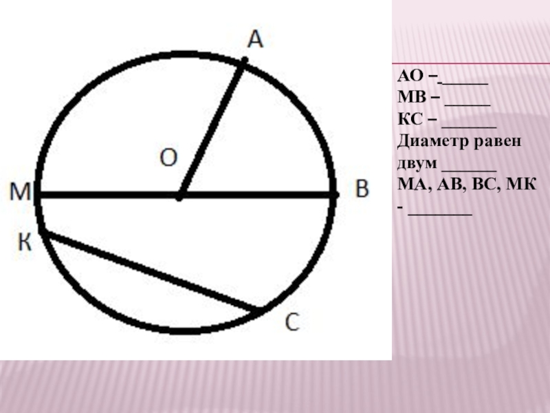 АО – _____МВ – _____КС – ______Диаметр равен двум ______МА, АВ, ВС, МК - _______